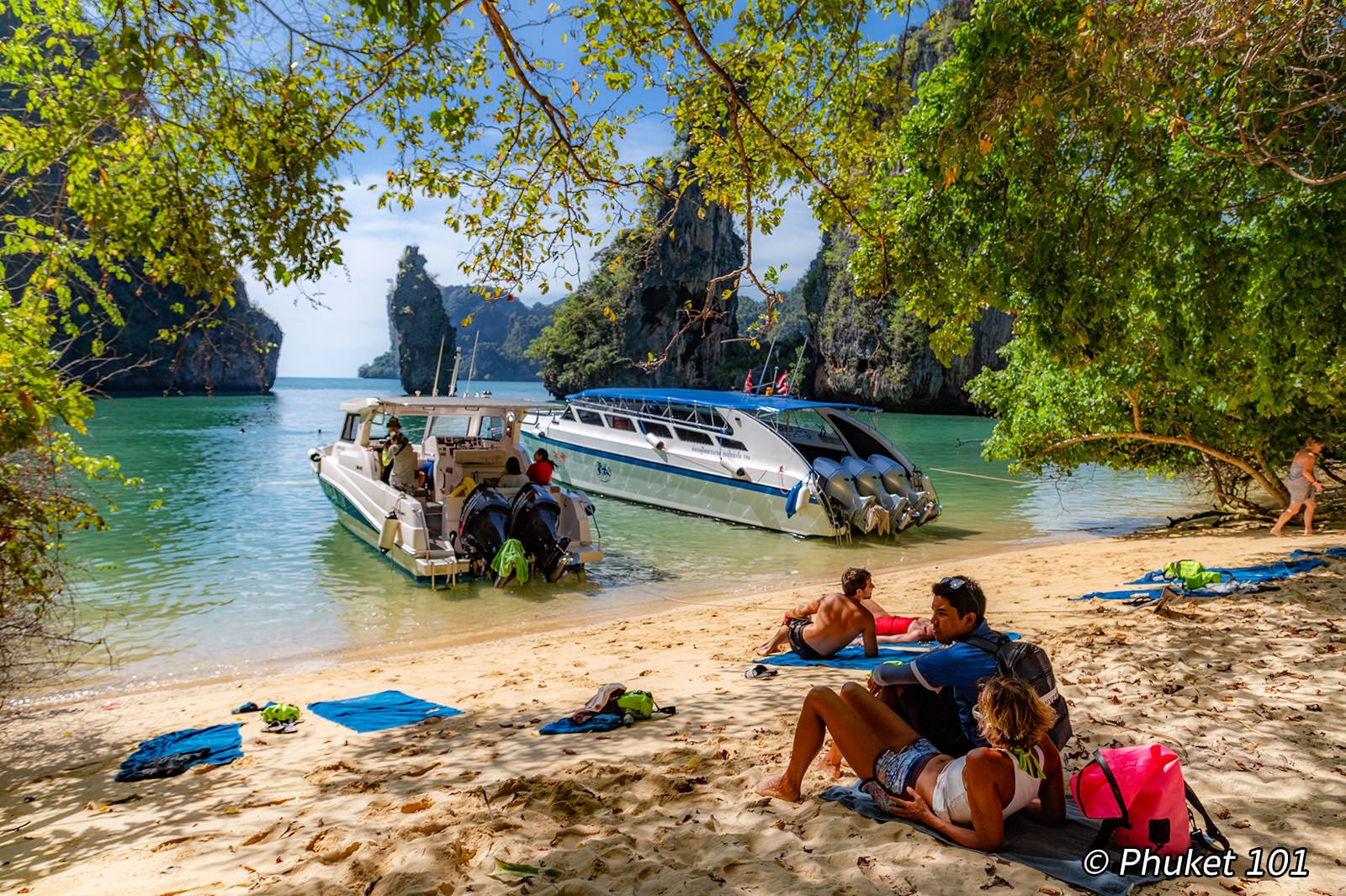 Three limestone pinnacles rise straight out of the water just offshore. They’re the island’s signature view, visible from the beach through a frame of overhanging branches. Speedboats anchor right on the sand, and you step off into knee-deep water.