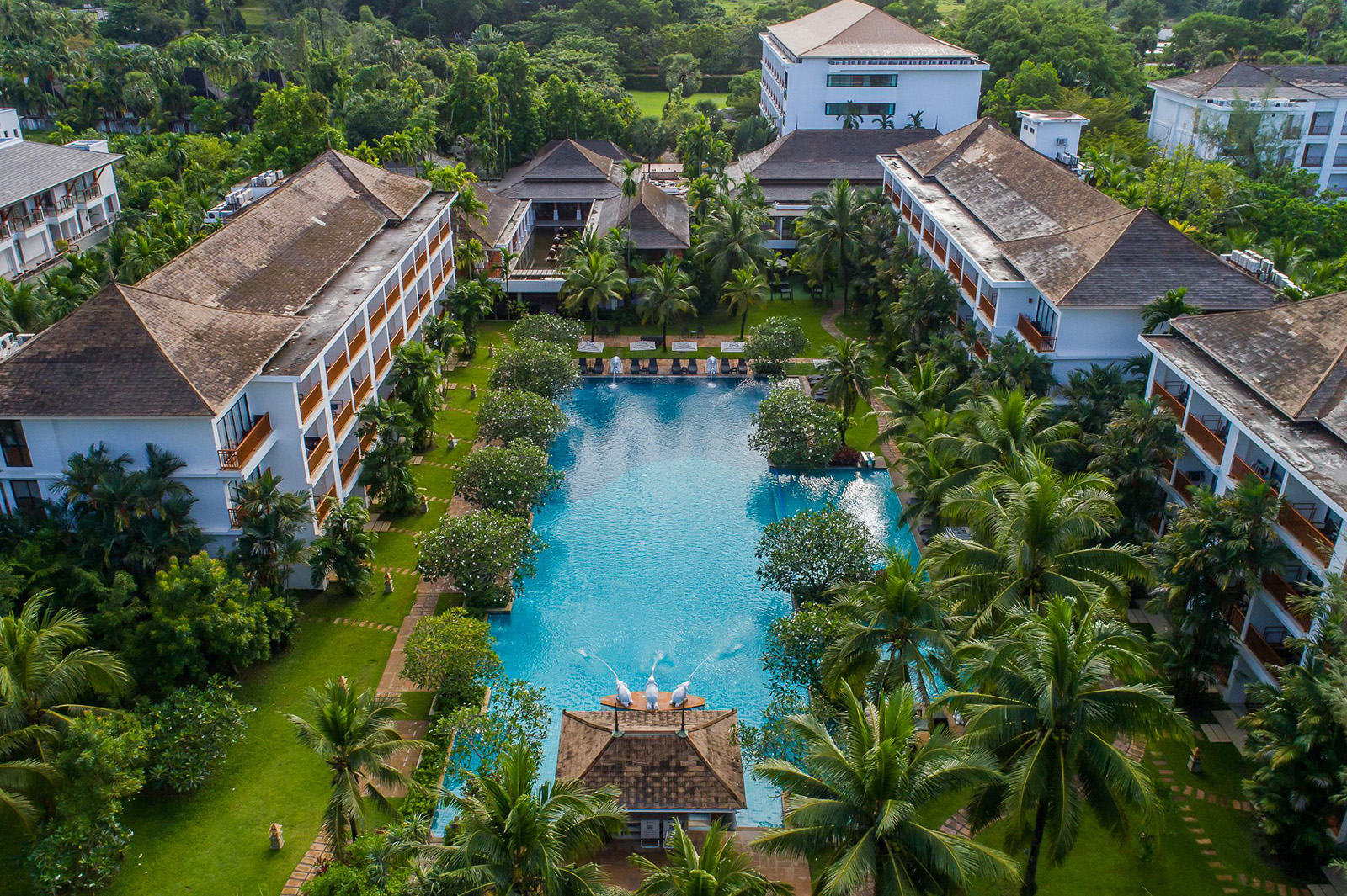 | Hotel | Four-star resort with 70 rooms across 20 rai. All rooms have balconies, air conditioning, and refrigerators. Pool view and garden view options. |